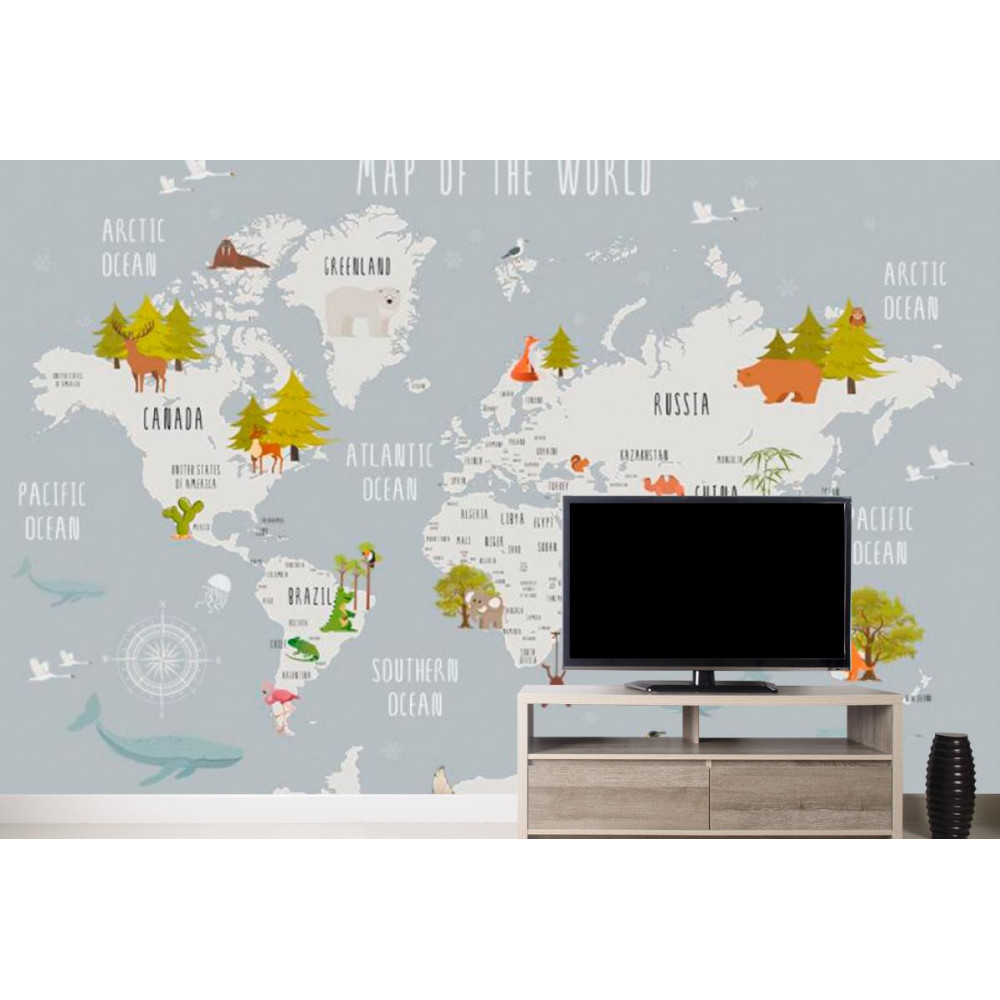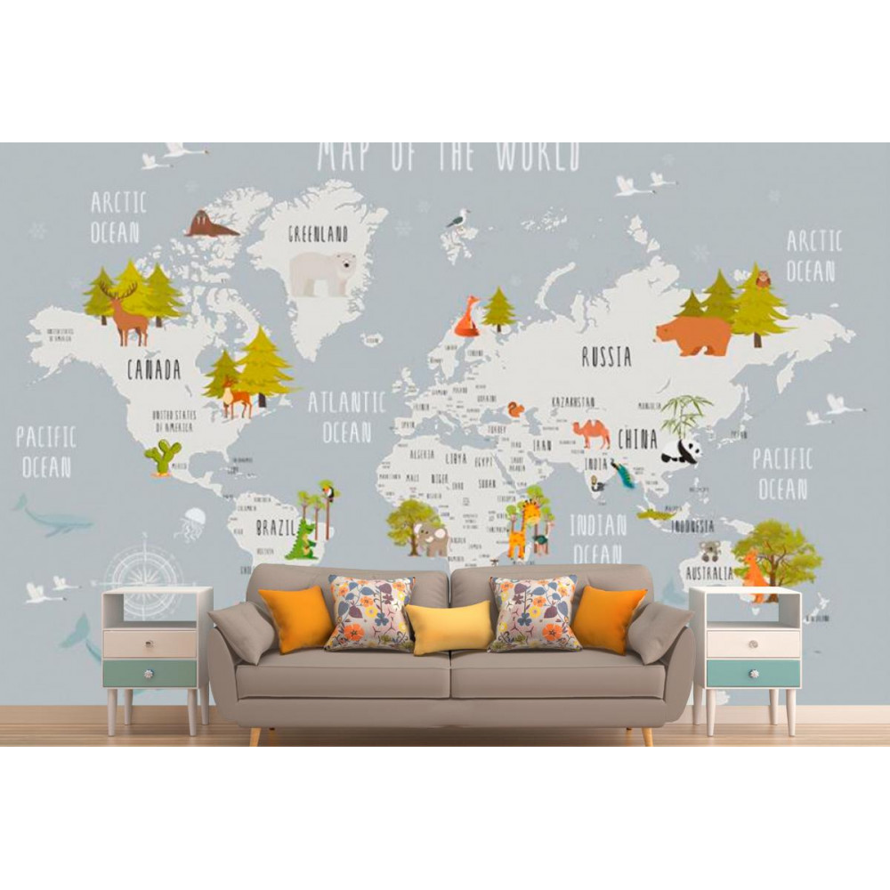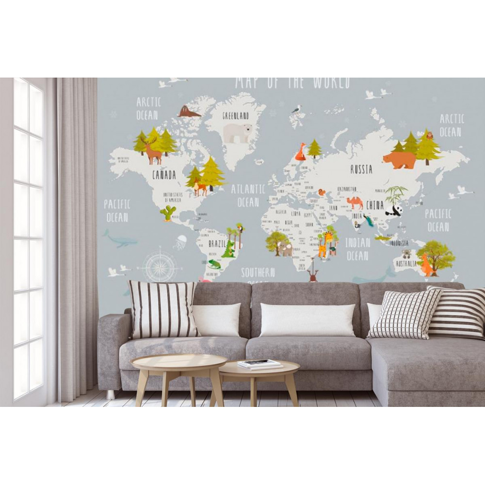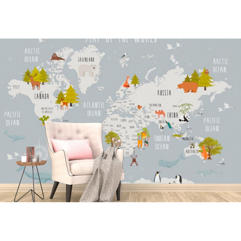 Фотошпалери Сіра карта світу з тваринами – чудова ідея для оформлення дитячої кімнати. Це повністю відповідає сучасним трендам, серед яких раніше розвиток дітей. Малюнок виконаний на світлому фоні, тому він відмінно впишеться в інтер'єр дитячої. На карті дитина знайде кумедних тварин і дізнається про місця їх проживання. Таким чином, освіта почнеться з веселої, пізнавальної гри.